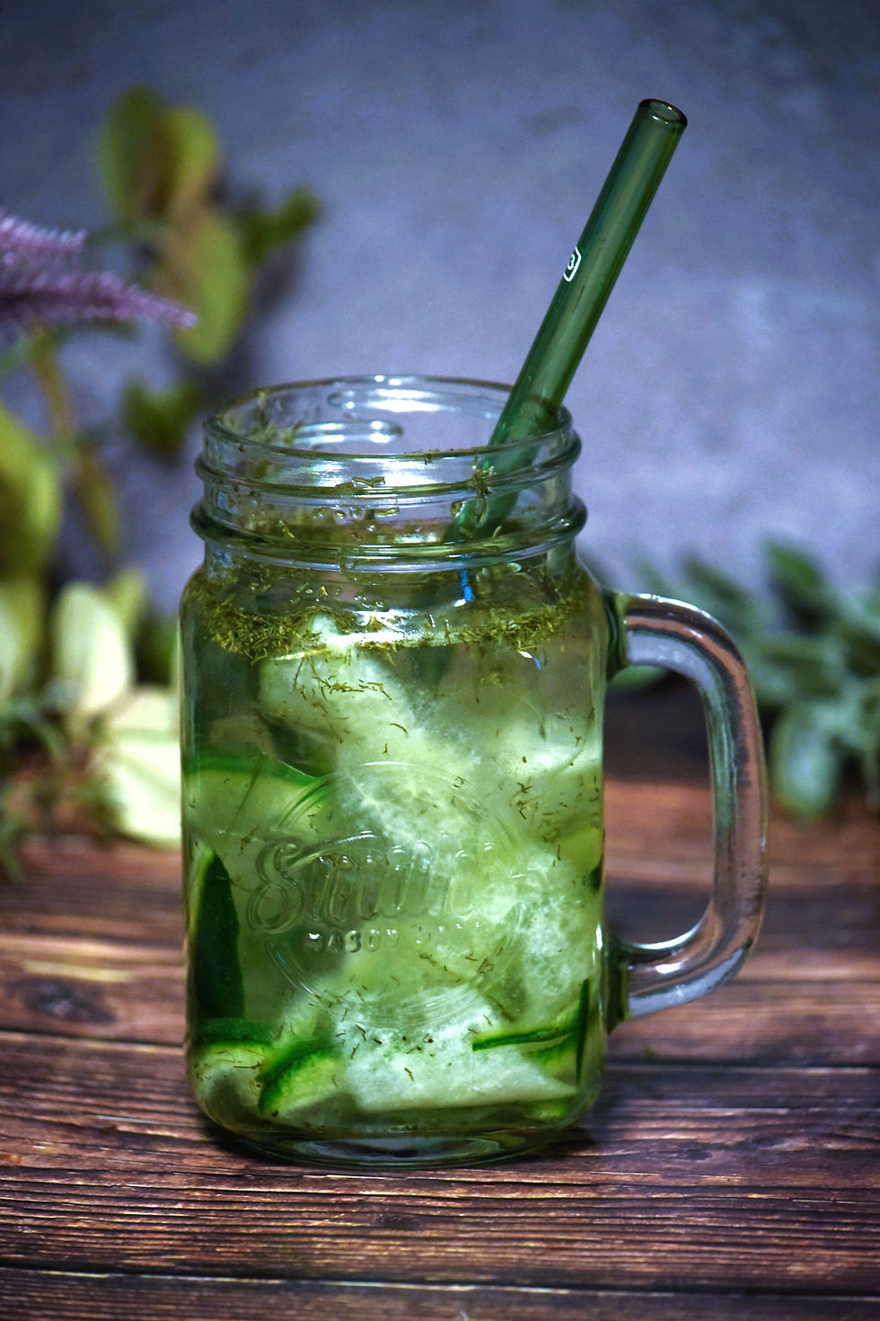 Gurken-Dill-Limonade in ein Glas mit Eiswürfeln gießen.